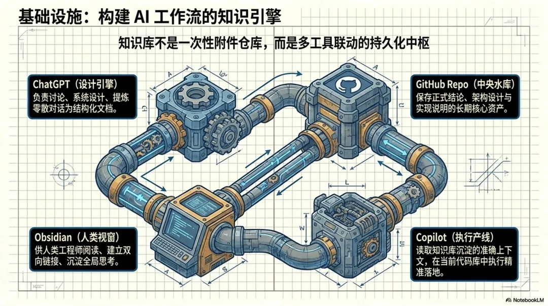 ChatGPT 更适合做讨论、设计、整理和沉淀;GitHub 知识库负责保存正式结论;Obsidian 负责阅读、链接和长期使用;Copilot 再基于这些沉淀去做工程落地。