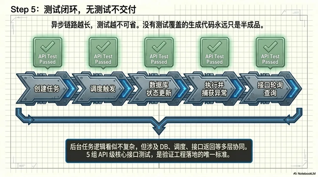因为很多 AI 辅助开发场景,做到“代码看起来差不多了”就停了。但如果没有测试验证,其实还停留在半成品阶段。尤其是像后台任务这种能力,看起来逻辑不复杂,但实际链路很长,涉及数据库、状态更新、接口返回、调度触发、异常处理。没有测试,后面一改就容易出问题。
