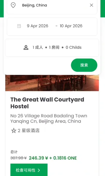 2. 搜索酒店:用拼音输入目的地(如北J输入“beijing”),选择【北J城区】;设置出行日期、1间房1个成人,点击【搜索】。