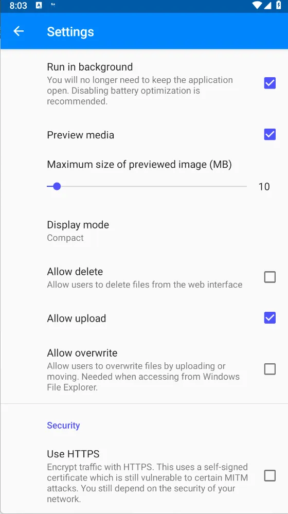 📌HTTP 文件服务器是一个简单的工具,允许您从台式机、平板电脑或其他设备访问手机的文件,无需任何特殊软件 – 只需一个网络浏览器。或者,它也可以充当 WebDAV 服务器,并且可以由任何 WebDAV 客户端访问。特征:– 类似文件管理器的Web UI,可以适应较小的屏幕– 下载单个文件或 ZIP 存档– 上传队列中的多个文件,创建目录– WebDAV服务器,支持任何WebDAV客户端– 在 Windows 中安装为网络驱动器(请参阅我的网站上的说明)– 提供静态 HTML 文件的选项– 使用自签名证书进行 HTTPS 加密 (如果需要也可以导入您自己的自定义证书)– 支持从其他应用程序共享文件– 限制删除/覆盖的选项– 支持基本身份验证– 体积小(<5MB)– 仅需要基本权限