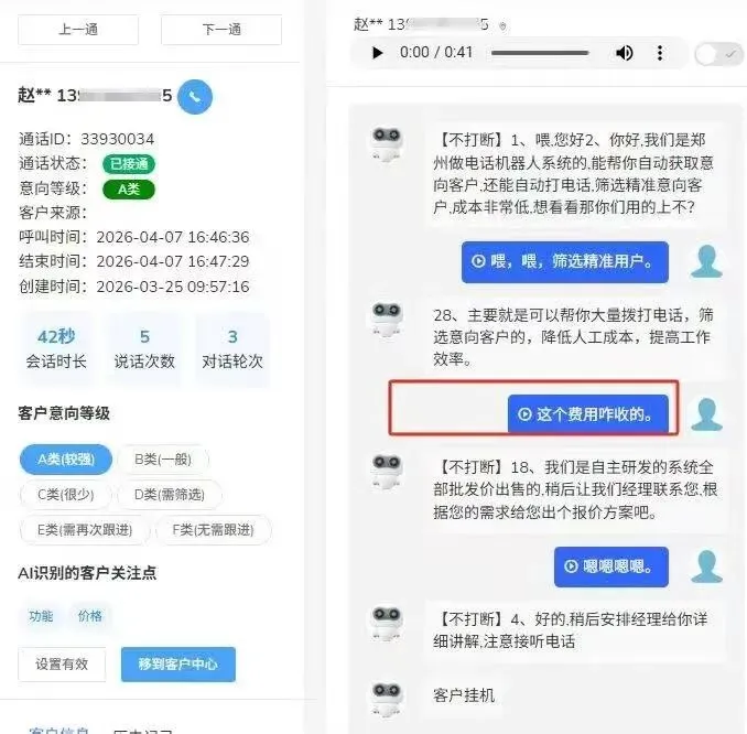 3、电话外呼机器人采用真人录音,不是机械自动生成的冷冰冰的语音。真人录制,拨打出去之后,和真人沟通一样!效果更好,且后续拨打过程中,后台还可以自动总结客户问题,话术里没有的,随时都能添加上