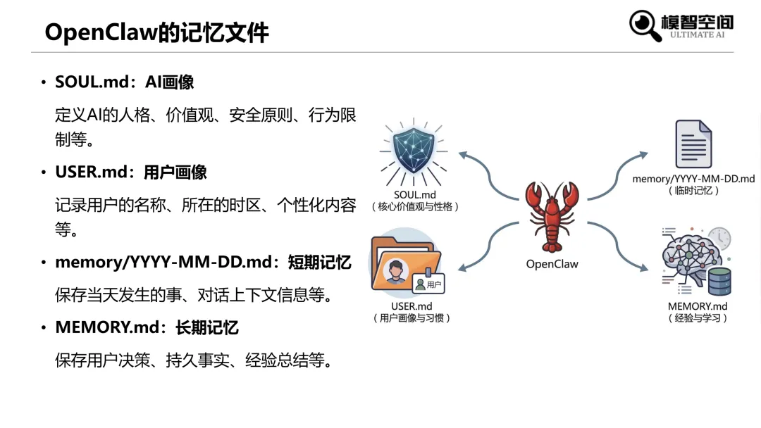记忆系统包含SOUL.md、USER.md、每日短期记忆文件和MEMORY.md。SOUL.md定义AI人格与安全原则,USER.md记录用户信息,短期记忆保存当日对话,MEMORY.md沉淀长期经验。这套设计解决了传统模型上下文有限、跨会话无记忆、认知不可编辑的痛点,让AI实现跨会话持久化学习,越用越贴合个人需求。