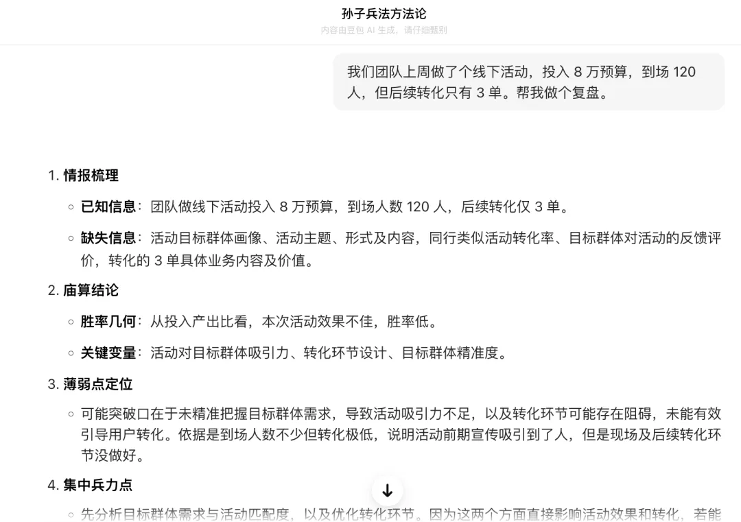 看到这种「先摸清情报、再做庙算、最后集中兵力」的输出,就说明 Skill 装好了。对比一下你平时用默认豆包问同样问题拿到的回答,高下立判。