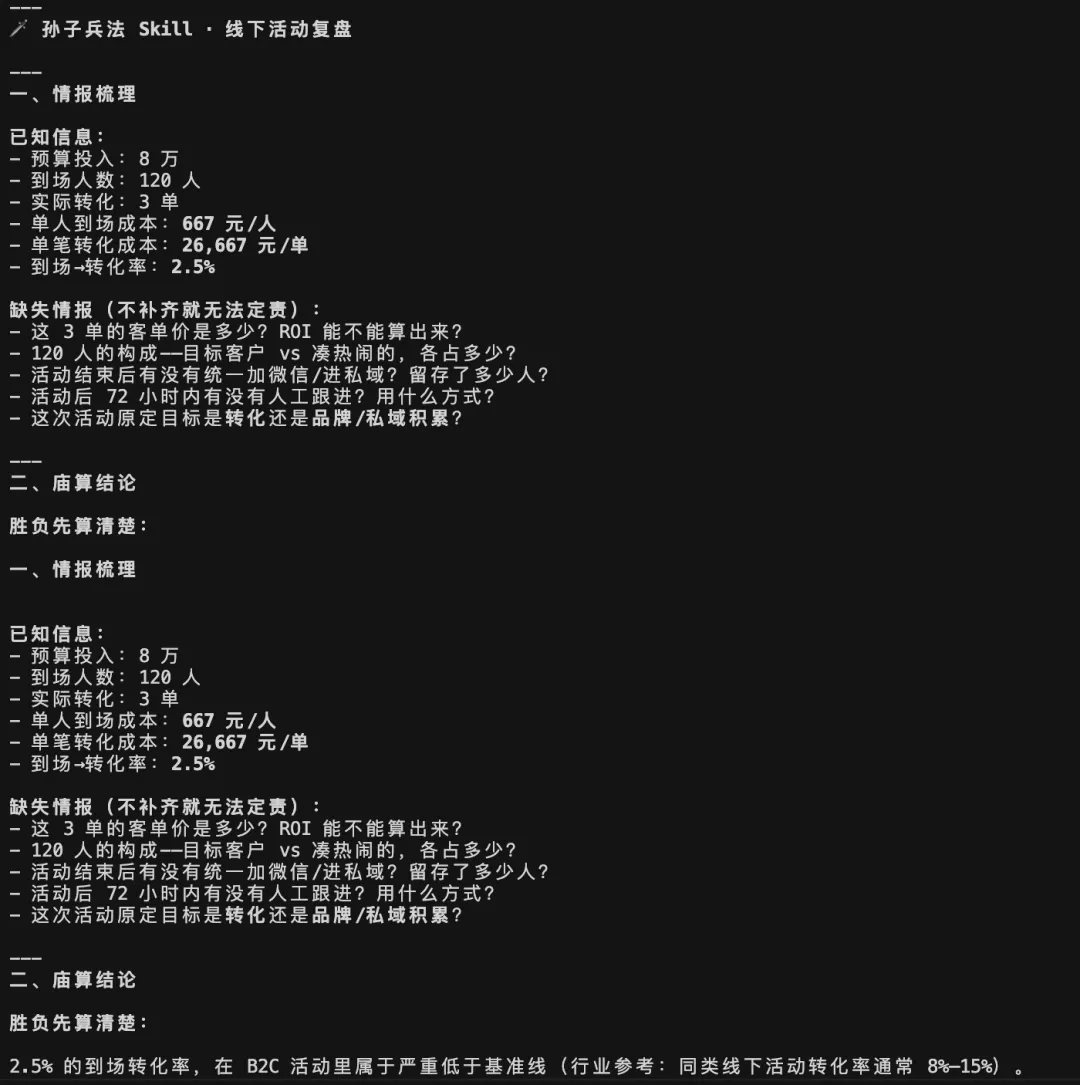 装了孙子兵法 Skill 的 AI:”核心败因是知己不足——对目标用户的真实需求没有庙算清楚,资源被平均分散在 5 个渠道,等于分兵迎敌。 证据:活动页 UV 达标但转化率低 60%。避实击虚的做法是——下次先做 30 人深度用户访谈锁定真实痛点,再集中预算打一个最高价值的渠道,而不是撒胡椒面。”