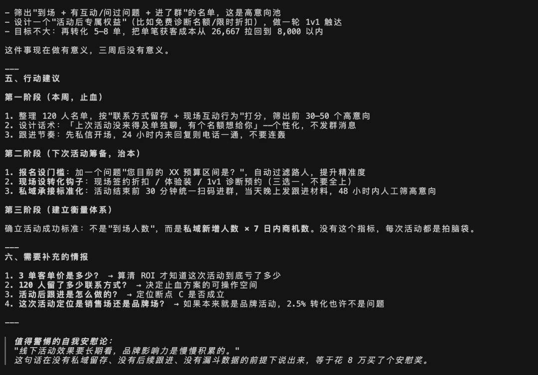 我们团队上周做了个线下活动,投入 8 万预算,到场 120 人,但后续转化只有 3 单。帮我做个复盘。