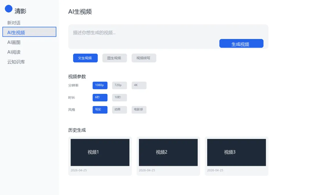 清影是智谱AI推出的视频生成工具,最大卖点就一个字:快。30秒就能生成6秒视频,其他工具动辄2-5分钟。2.0版本已支持生成10秒、4K、60帧超高清视频。