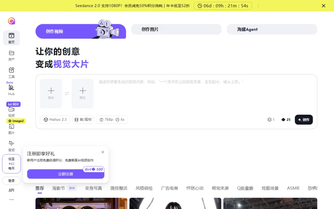 免费用户每天有6次生成机会。支持文生视频、图生视频和视频续写,单次最长能生成2分钟视频——这个时长在同类产品里是天花板级别。3.0系列模型还支持音画同步,运镜、光影、物理模拟都很自然。