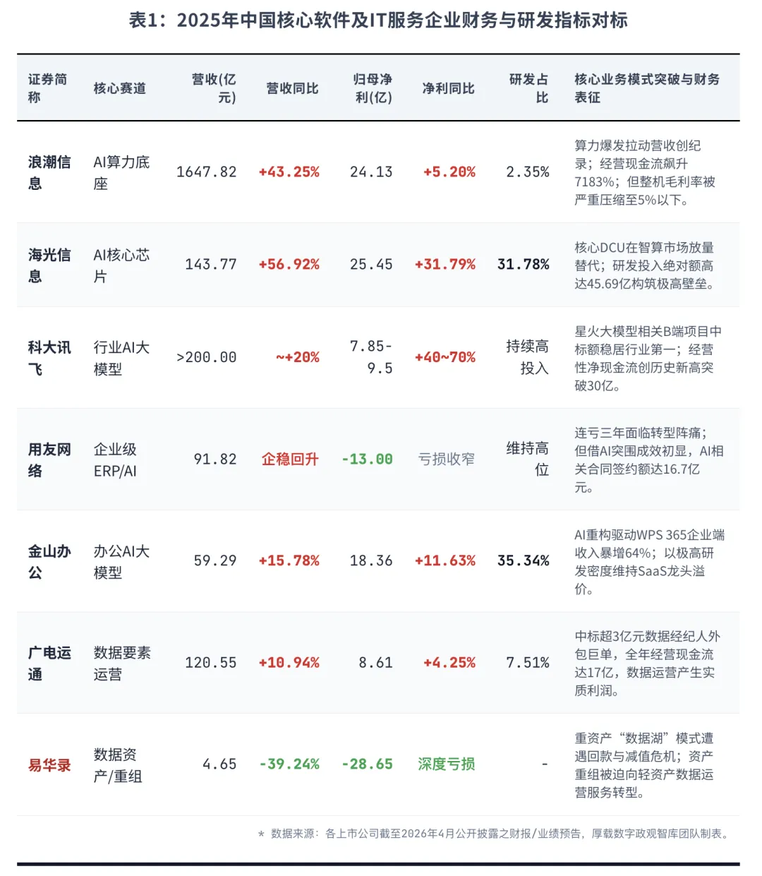 为了更为直观、结构化地展现人工智能与数据要素两大核心技术变局对软件及IT企业经营状况的综合影响,以下提取并编制了部分具有代表性的核心企业在2025年度的关键财务与运营指标横向对比表,并进行深度解析: