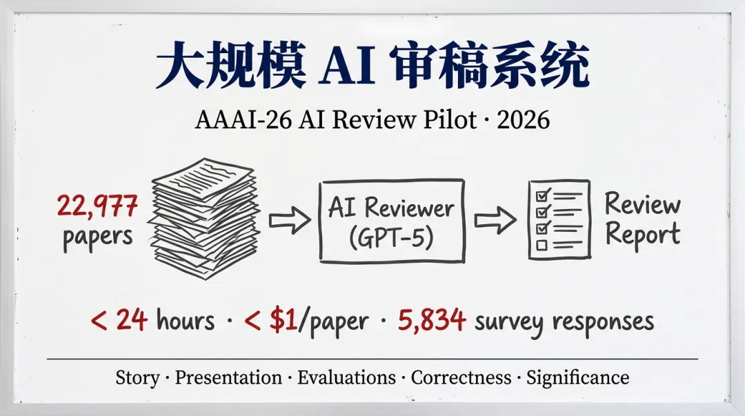 实践层面:在 AAAI-26 这一顶级 AI 会议的真实评审流程中,成功完成了有史以来规模最大的 AI 审稿部署实验。22,977 篇论文、24 小时内、<$1/篇——这三个数字证明了 AI 辅助评审在真实会议规模下的操作可行性。