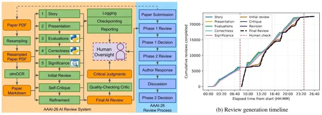图1:左图为 AI 审稿系统的五阶段架构及自我批评修订流程;右图为所有 22,977 篇论文的审稿生成时间线,展示了先处理 30% 样本进行人工抽查、再推进全量生成的分批策略。