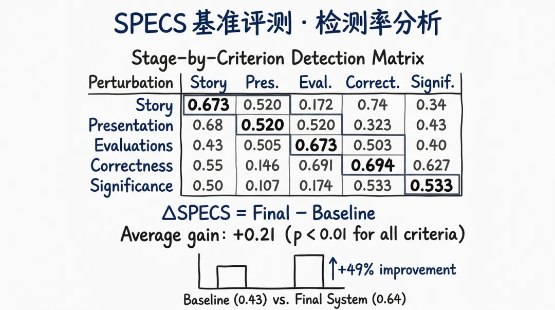 基准层面:SPECS 基准提供了一套可复现的、覆盖五个评审维度的综合评测框架,为后续 AI 审稿系统的研发和比较提供了标准化工具。完整系统相对单一 prompt 基线的平均检测率提升 +0.21(p 远小于 0.01)。