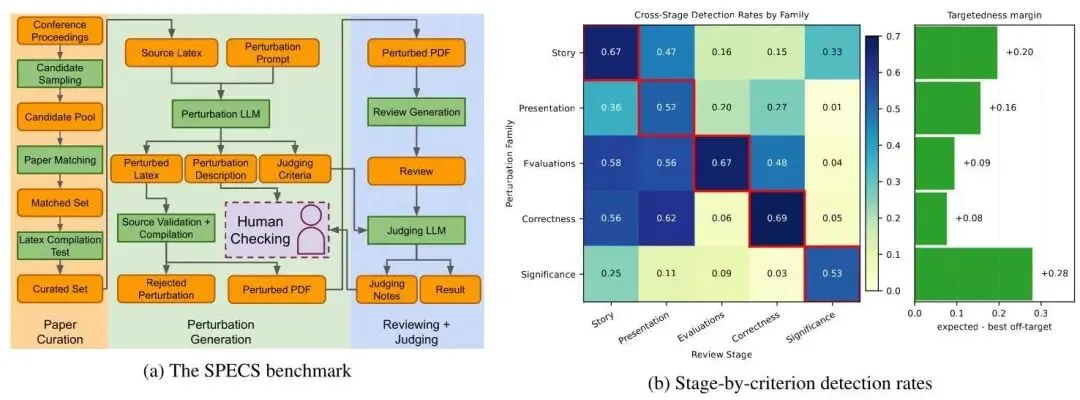 图4:左图为 SPECS 基准的数据构建流程(从 AAAI-25 论文集→arXiv 匹配→LaTeX 扰动生成→编译验证);右图为各审稿阶段在各 SPECS 维度上的检测率矩阵,对角线元素均为最高值,证明每个阶段对其目标维度的专项检测效果最强。