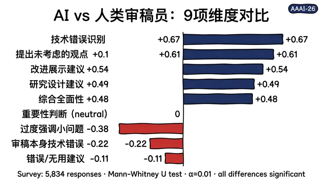 质量层面:大规模用户调查(5,834 份有效响应)显示,在 9 项评审质量维度中,AI 审稿在 6 项上获得了参与者的更高评分,尤其是技术错误识别(+0.67)和提出未被考虑的新观点(+0.61)两项领先优势最为突出,且所有差异均达到强统计显著性()。