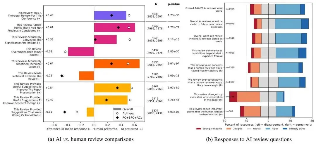 图2:左图展示 9 项评审质量标准的 AI-人类均值差异;右图为 AI 审稿专项问题的响应分布。