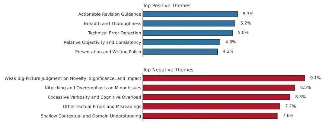 图3:AAAI-26 AI 审稿的前五大正面与负面主题,百分比为该主题在所有专项分类提及中的占比。