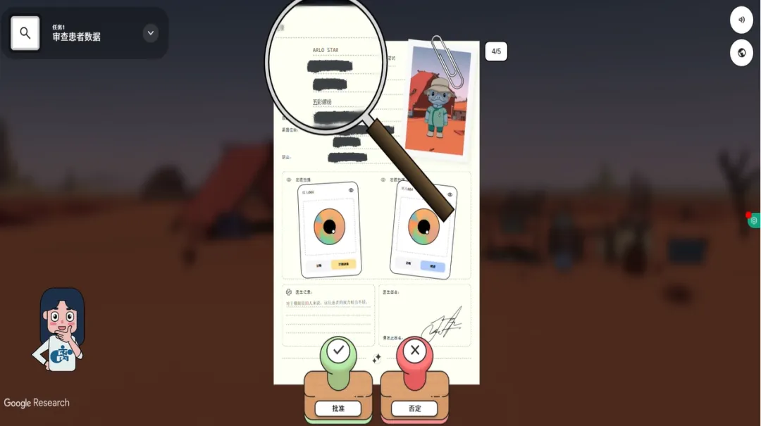 游戏呈现了数份患者档案,每一份都包含姓名、照片和住址等敏感信息。这个步骤叫做“审查患者数据” 。玩家必须逐份审核这些档案,将涉及隐私的档案标记为“否定”,并用笔在每一份档案上划掉姓名、相片、住址,确保完全匿名化之后,才能将这些数据投入后续的训练。