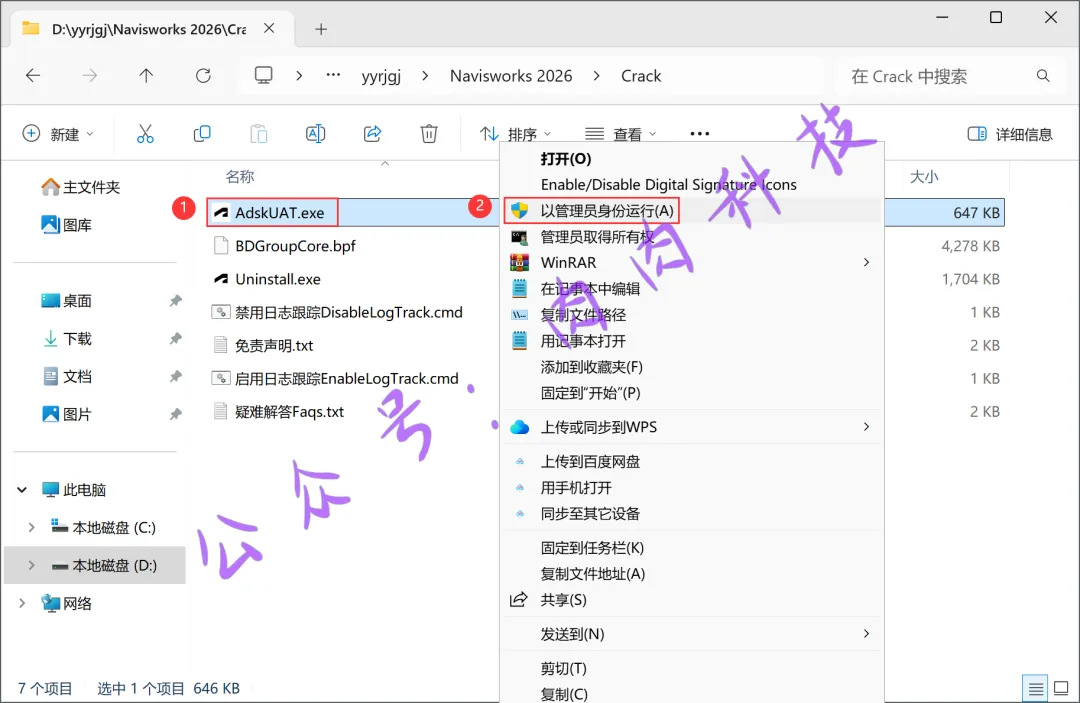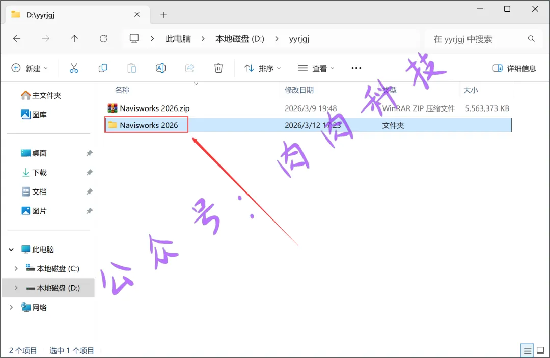 1.将Navisworks 2026软件安装包下载到电脑上,我是下载到D盘的一个英文文件夹内。右键Navisworks 2026安装包,点击【解压到当前文件夹】