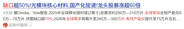 全球需求已突破280万片,有效产能仅113万片,缺口率高达70%,供需严重失衡。叠加地方政策强力扶持,磷化铟赛道迎来量价齐升黄金期!