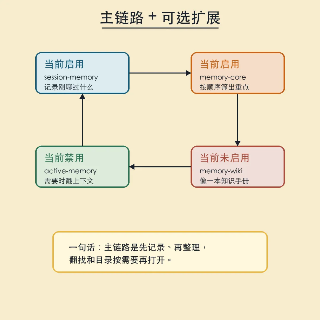 session-memory 负责捕获会话上下文(Bundled Hook,当前已启用),memory-core 负责 Dreaming 三阶段晋升(Plugin,当前已启用);active-memory 负责对话时检索注入(Plugin,当前禁用),memory-wiki 负责 Wiki 知识库编译(Plugin,当前未启用,是可选扩展)。