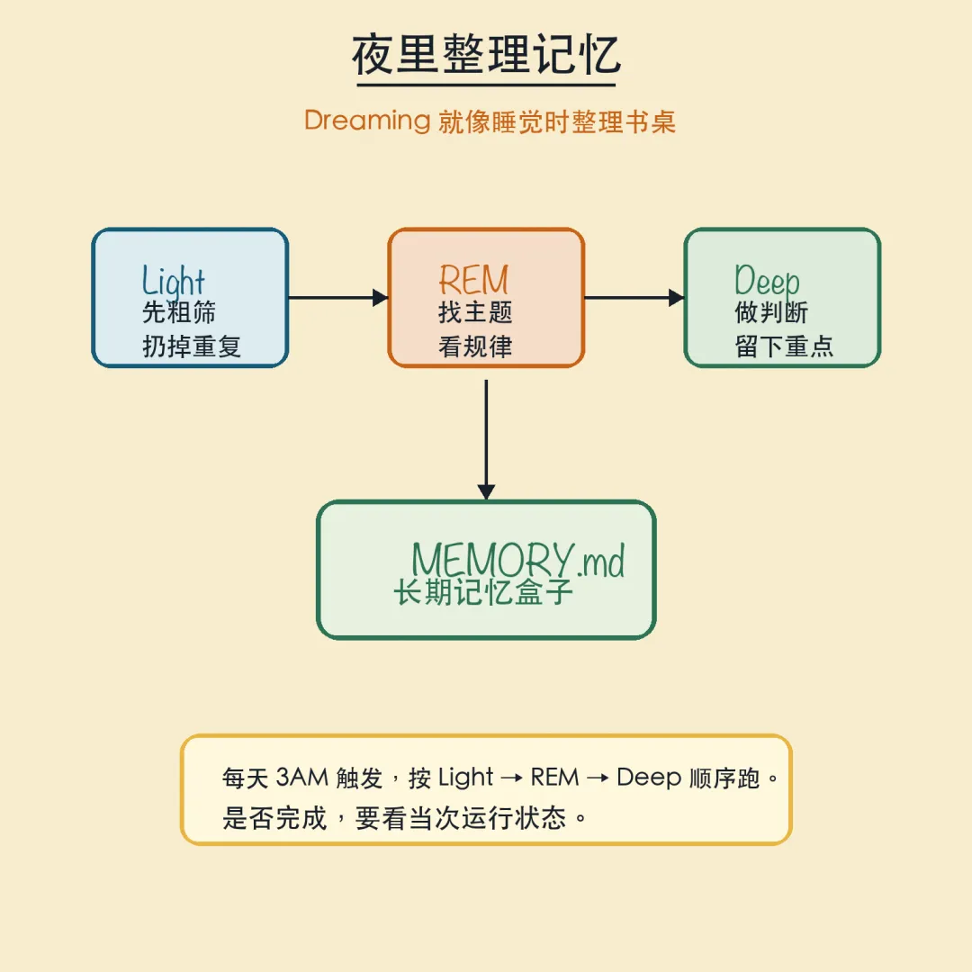 :Dreaming cron 每晚 3AM 触发,是否完成要看当次运行状态 - 三阶段晋升