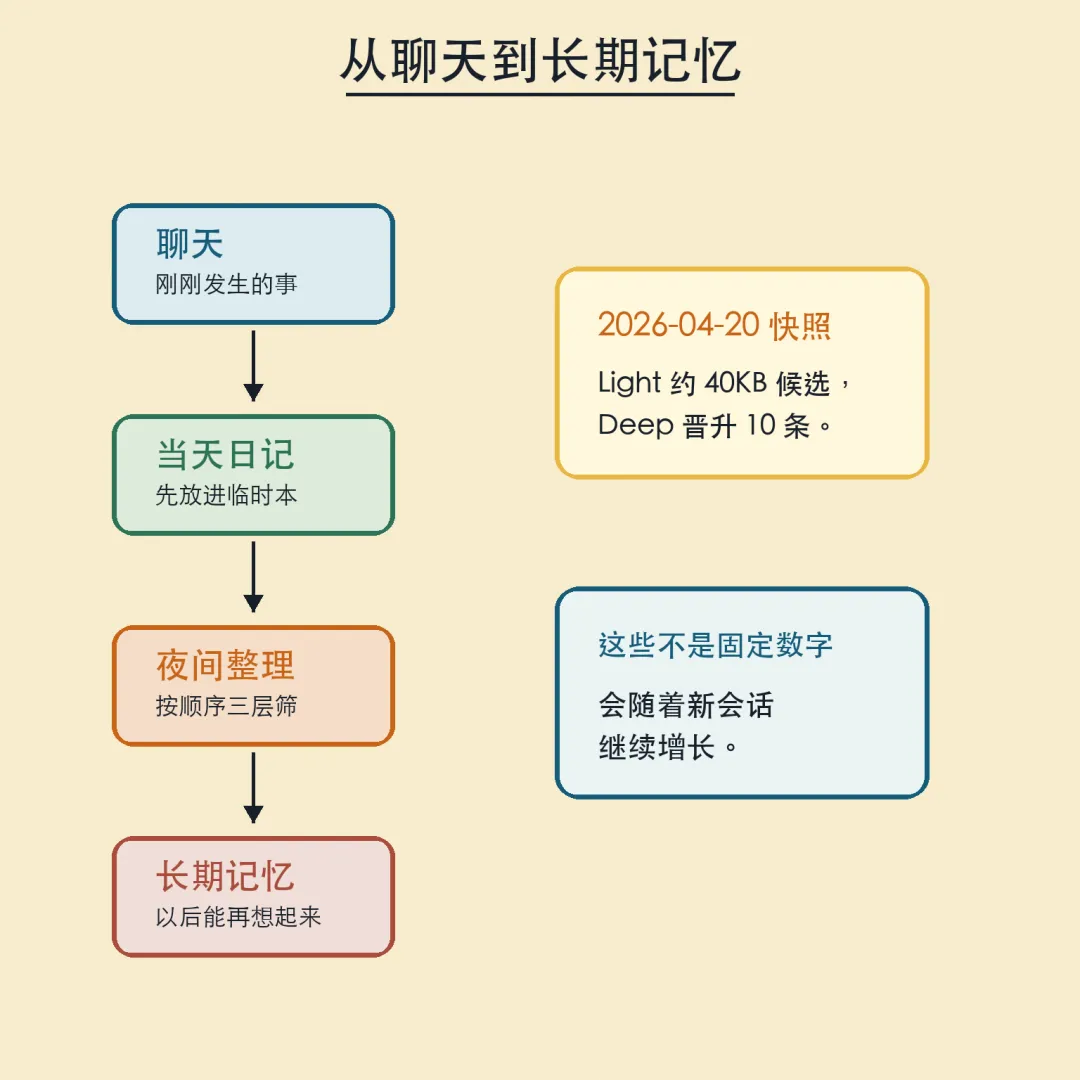 数据从会话交互开始,经 session-memory hook 提取最近 15 条消息写入日记,进入 short-term-recall.json。以 2026-04-20 当时快照为例:short-term-recall.json 约 604KB、17,369 行,日记文件累计 8 个、约 60KB。随后 Dreaming cron 每晚 3AM 依次跑 Light → REM → Deep。2026-04-20 当次运行中,最终晋升到 MEMORY.md 的是 10 条记录,当时 MEMORY.md 约 40KB。