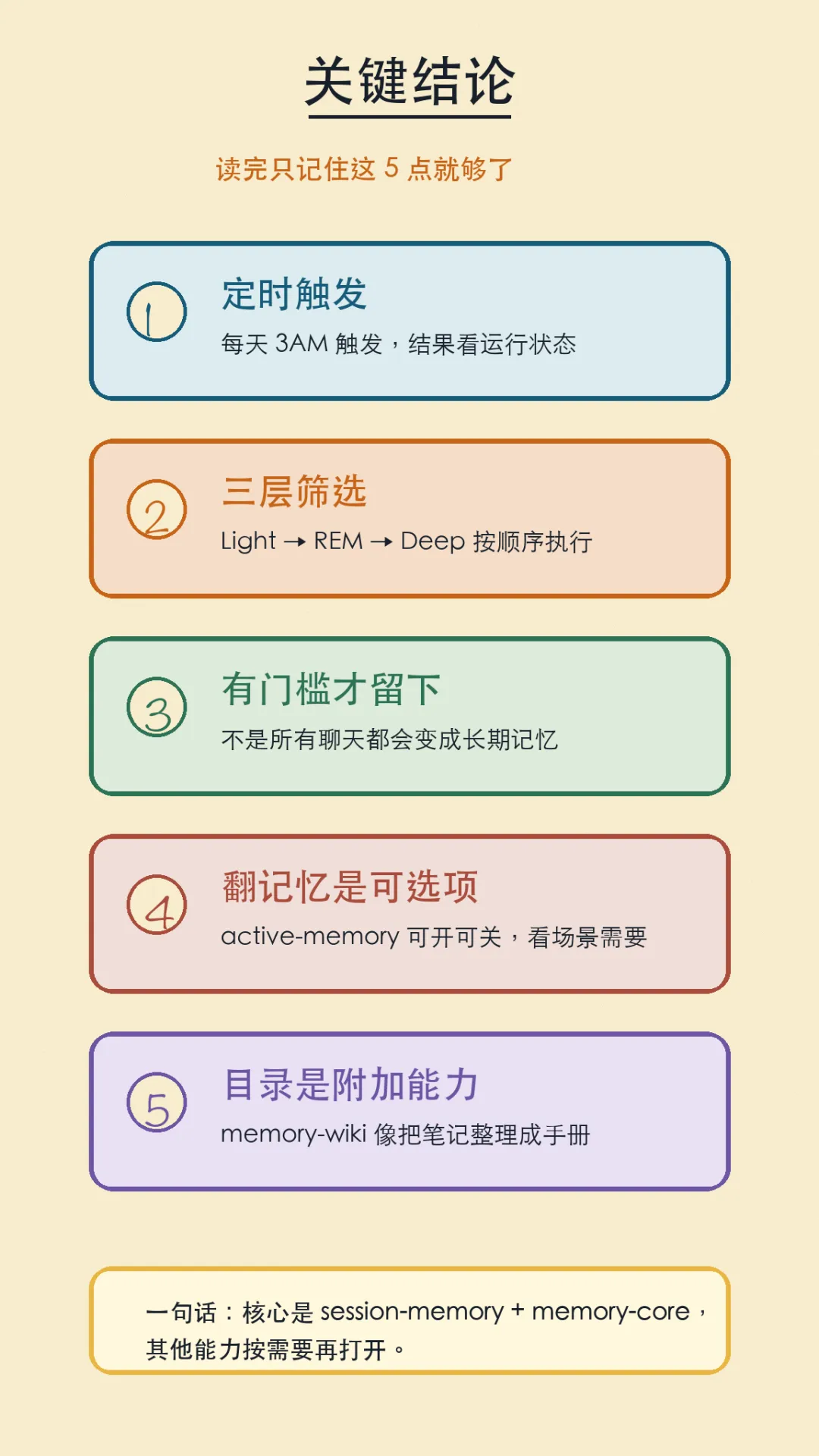 :不是所有内容都晋升,需要 score≥0.8 + recall≥3 + uniqueQueries≥3 - active-memory 可选
