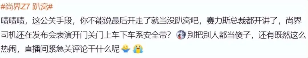 在此期间,赛力斯汽车总裁何利杨已登台开始进行问界M6的讲解,与停留在舞台中央的尚界Z7意外同框,场面一度颇为尴尬。即便直播间紧急关闭了评论区,仍未阻挡舆论的发酵,“尚界Z7趴窝”等相关话题迅速冲上热搜。