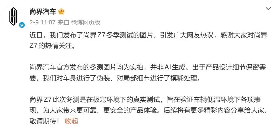 面对舆论质疑,尚界品牌于2月9日发布紧急回应,强调所有冬测图片均为实车拍摄,并非AI生成。对于画面异常,官方解释是“出于产品设计细节保密需要,对车身进行了伪装、对局部细节进行了模糊处理”。
