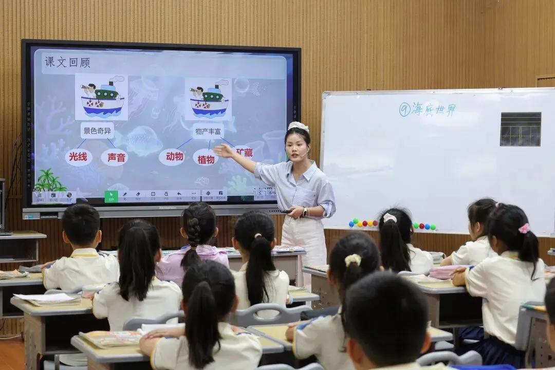在黄秀妹老师执教的《海底世界》课堂上,AI技术让科普教学焕发新活力!AI动态可视化课件直观呈现海参、梭子鱼的运动姿态,破解说明方法难点;AI高清影像还原海底生物奇观,让学生沉浸式感受海底的奇异与丰富。结合角色扮演、小组探究,孩子们在互动中掌握“从不同方面写清楚”的方法,AI赋能让语文课堂兼具科学性与趣味性,也悄悄给学生播下了保护海洋的种子。