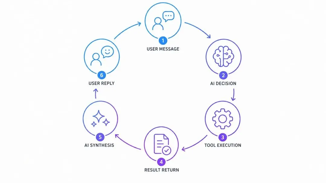 AI 看到工具描述,决定调用哪个,传什么参数。
