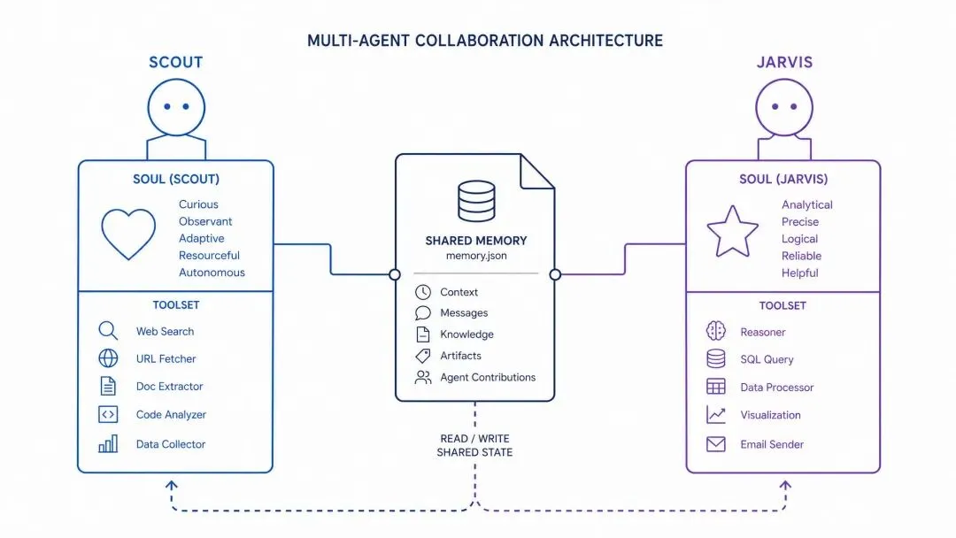 每个 Agent 都有自己的对话历史,但它们共享同一个记忆目录。Scout 保存研究发现;Jarvis 之后可以搜索这些发现。它们通过共享文件进行协作,而不需要直接通信。