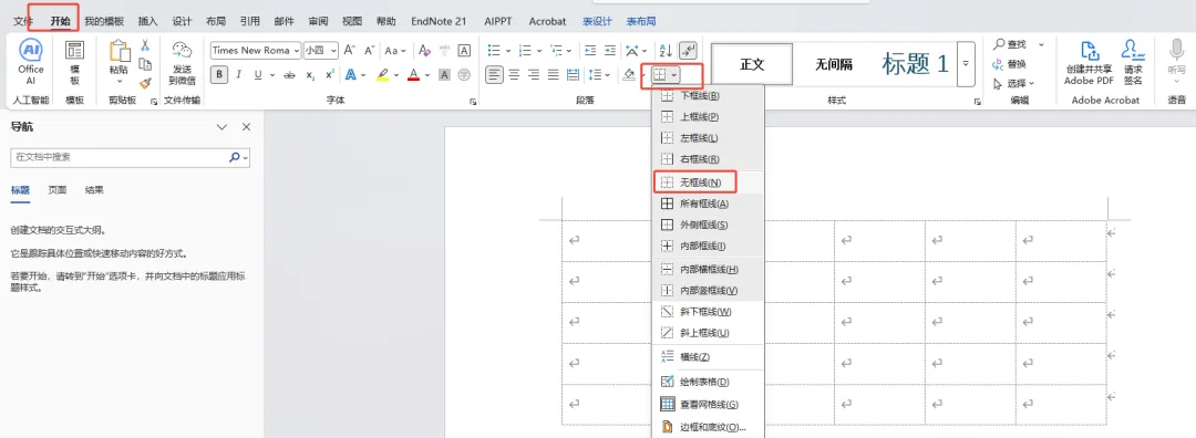 在【开始】选项卡下找到【表格框线】,下拉找到【无框线】,去掉所有边框。