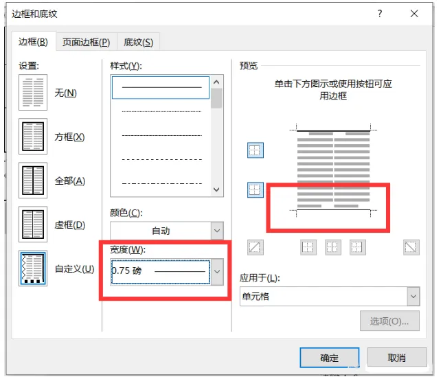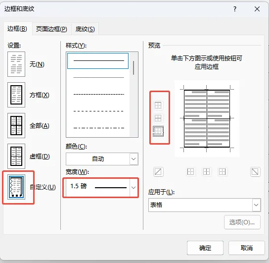 在【开始】选项卡下找到【表格框线】,下拉找到【边框和底纹】,调整边框线条宽度为1.5磅,鼠标点击【预览】窗口的顶线和底线。