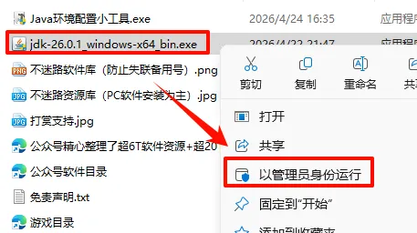 2.打开刚刚解压的文件夹,选中”jdk-26.0.1_windows-x64_bin.exe”,鼠标右键选择“以管理员身份运行”