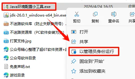7.返回安装包,选中”Java环境配置小工具.exe”,鼠标右键选择“以管理员身份运行”