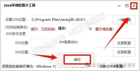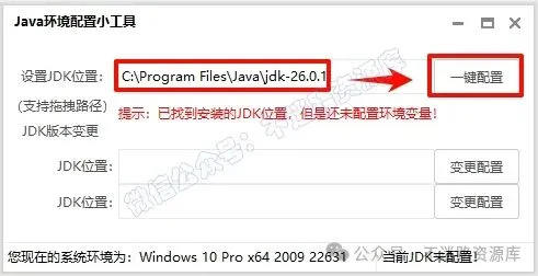 8.在JDK位置输入:C:\Program Files\Java\jdk-26.0.1(参看第4步),点击“一键配置”