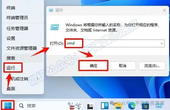 10.按住键盘的win+R调出运行界面或者鼠标右键开始菜单选择“运行”,输入:“cmd”,点击“确定”