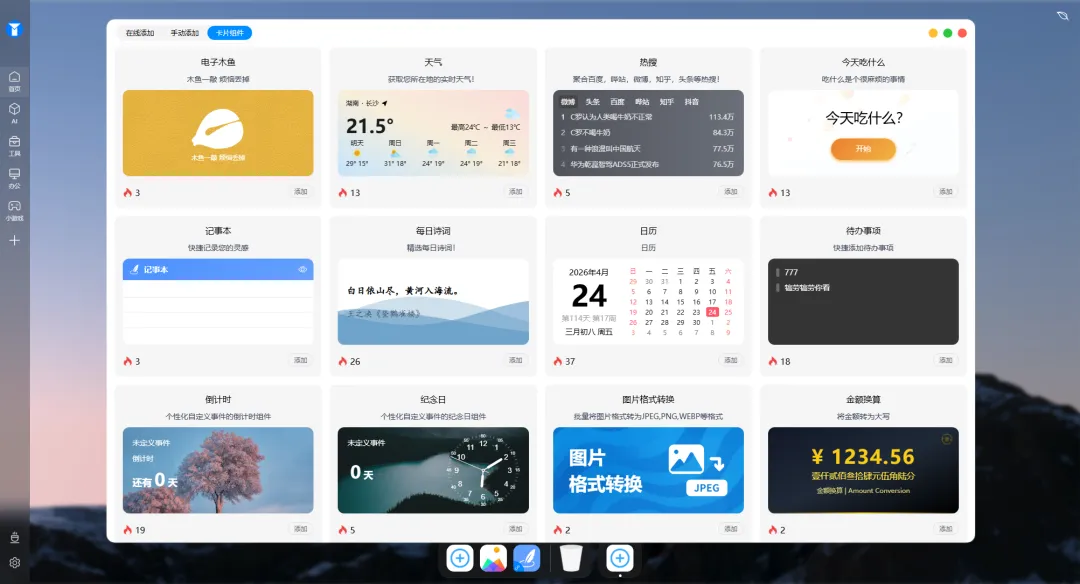这不仅仅是一个网址导航,更是一个全能的效率面板。只需在页面空白处右键点击选择「卡片组件」,就能解锁超多实用功能👇