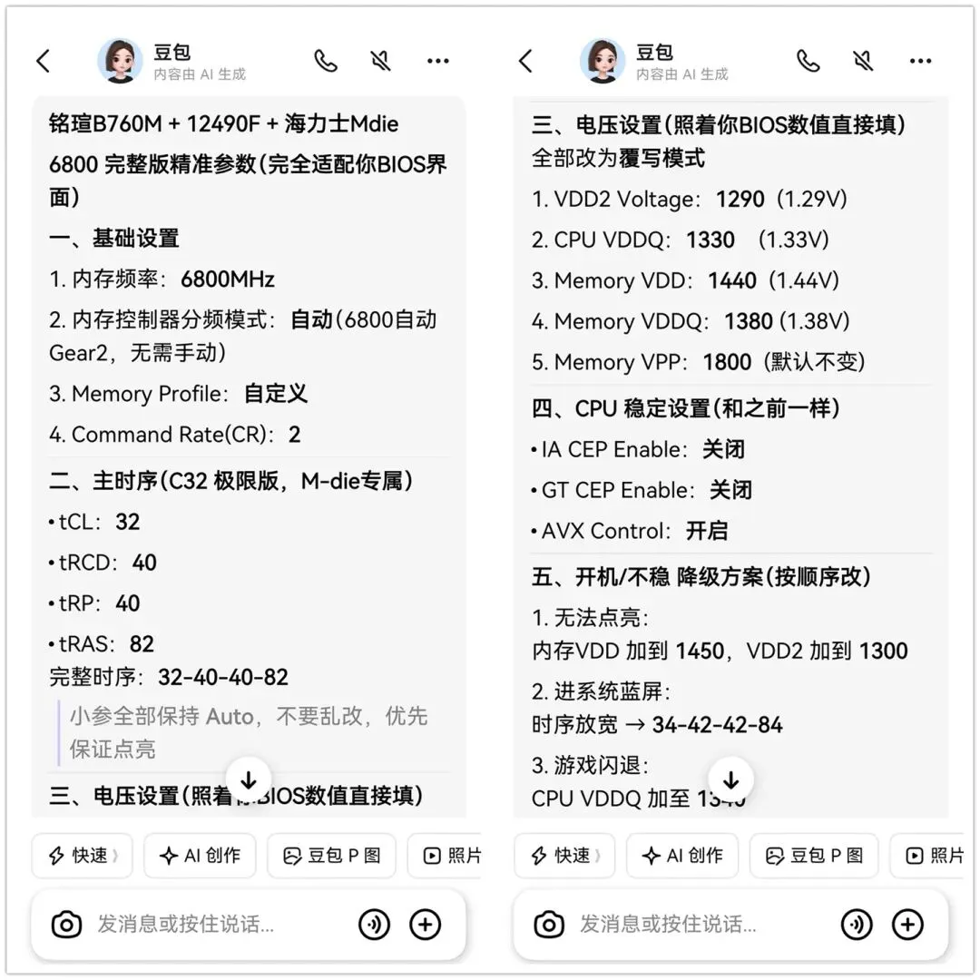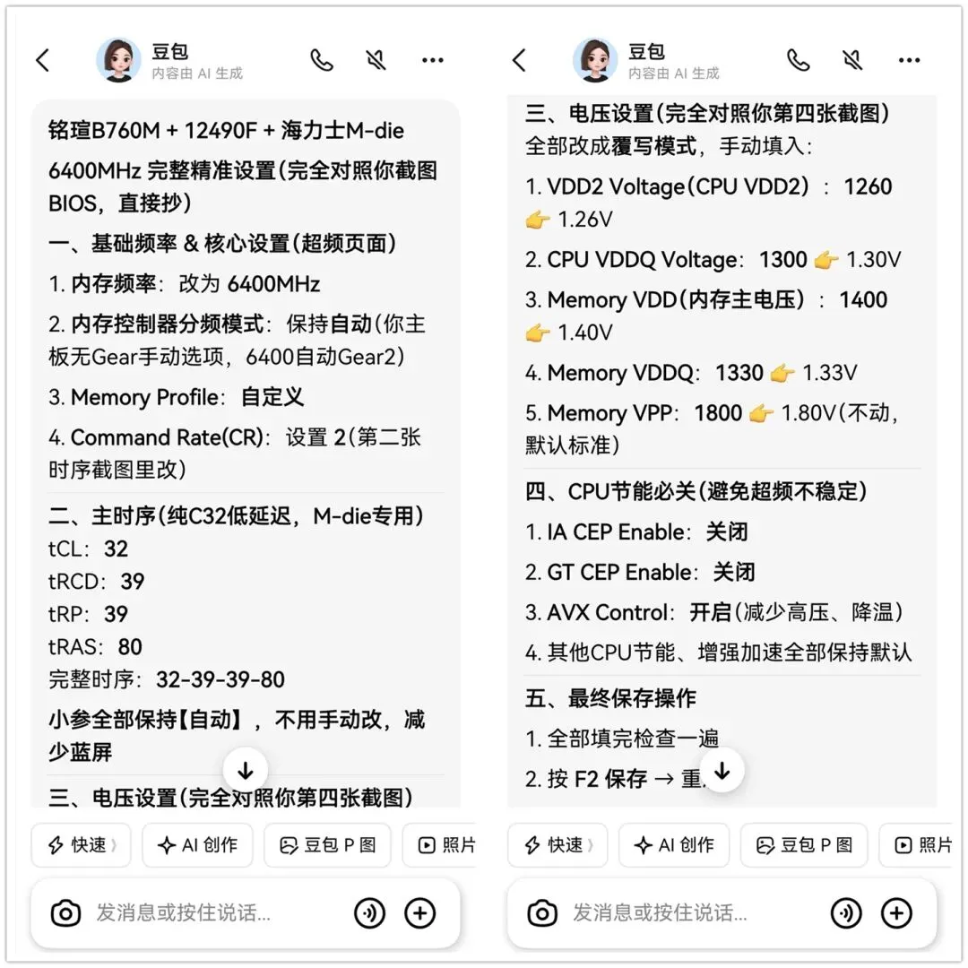 我直接把上面这三张图,扔到AI里,然后让它直接给出我的PC平台,适合的超频参数。