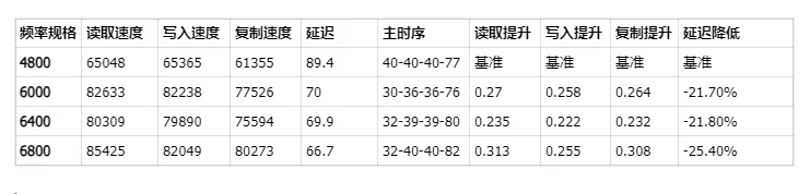 为了直观展示不同频率的性能差异,我做了一个表格,以默认频率4800为基准,查看超频以后,内存的性能提升。