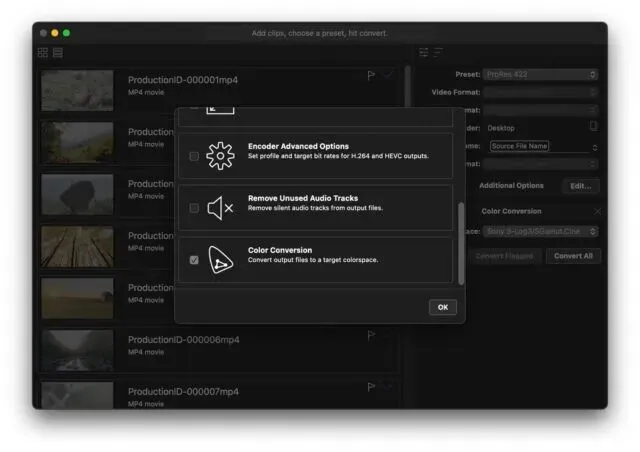 不同品牌、不同 Log 曲线的相机拍摄的素材在进入剪辑流程时,往往需要先套用 LUT 将其从灰片还原为正常色彩或匹配到统一的监看风格。EditReady 允许在转码过程中直接嵌入 LUT(.cube 格式),这意味着转码后的文件已经完成了色彩还原,Premiere 或 Final Cut Pro 的时间线上看到的直接就是经过调色的画面,无需再逐个添加 LUT 效果。对于有统一调色风格的团队(比如 S-Log3 转 Rec.709 + 轻微胶片感),可以将固定 LUT 保存为预设,每次导入新素材时一键应用,极大提升批次处理效率。