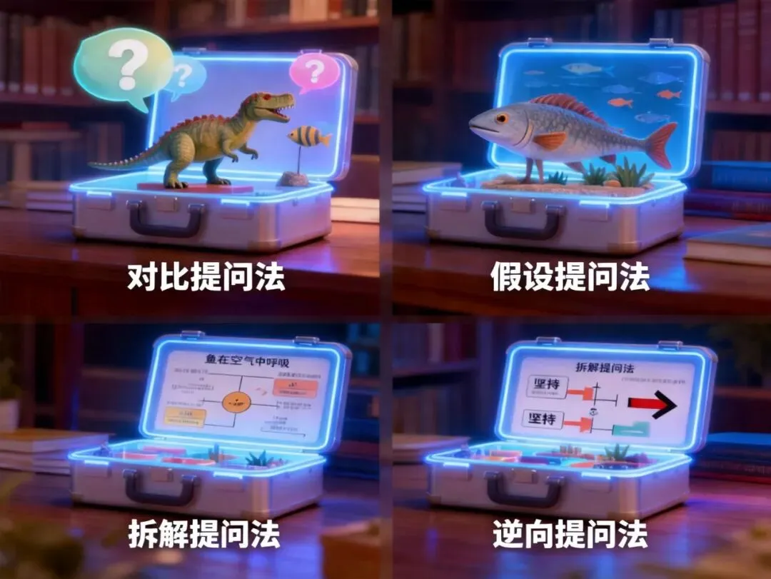 一共四个提问方法,一个是对比提问法,恐龙和鸟类,有什么相似和完全不同?可以培养观察与分类思维。另二个是假设提问法,如果鱼能在空气中呼吸,世界会怎样?可以激发想象力与推理能力。再一个是拆解提问法,你觉得‘坚持’做一件事,可以分成哪几个小步骤?可以将抽象概念具体化。最后是逆向提问法,大家都说失败是坏事,那它可能带来什么好处?可以锻造逆向思维。