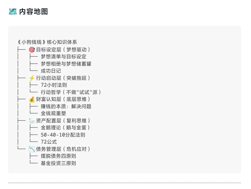 比如我最近用这个方法处理了《小狗钱钱》,AI帮我提取了12个核心知识点:72小时法则、金鹅理论、50-40-10分配法则……每个知识点都配有案例和行动指南。