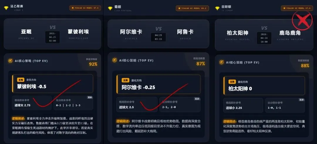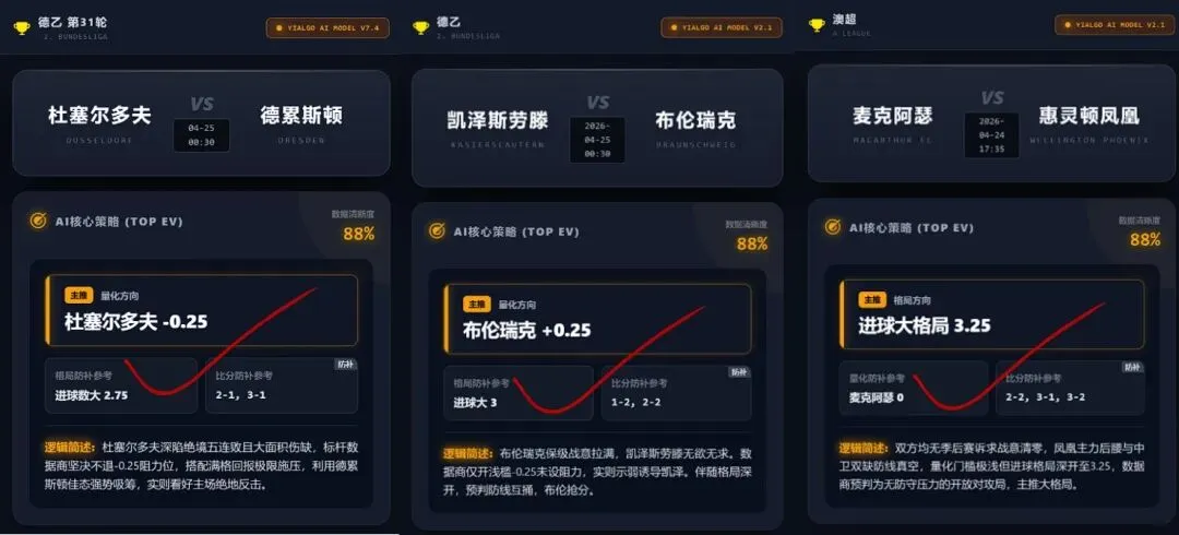 【回顾内容】本次回顾6场赛事取得5红1黑的优异战绩,其中包含2场完美“三项红”。Yi-Algo AI 在阿尔维卡与杜塞尔多夫的比赛中展现出极强的风控避险与卡位预测功力,精准识破数据商的高阻洗盘意图并全数命中。亚眠与麦克阿瑟的对阵也依靠深度数据拆解稳获“双红”。近3天17√15保持亮眼的成绩!
