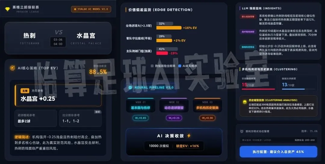 YiAlgo AI Model 量化分析模型是抛弃主观情感、纯粹由大语言模型与数学期望驱动的赛事分析引擎。为你在深不可测的数据博弈中,寻找理性的出路。