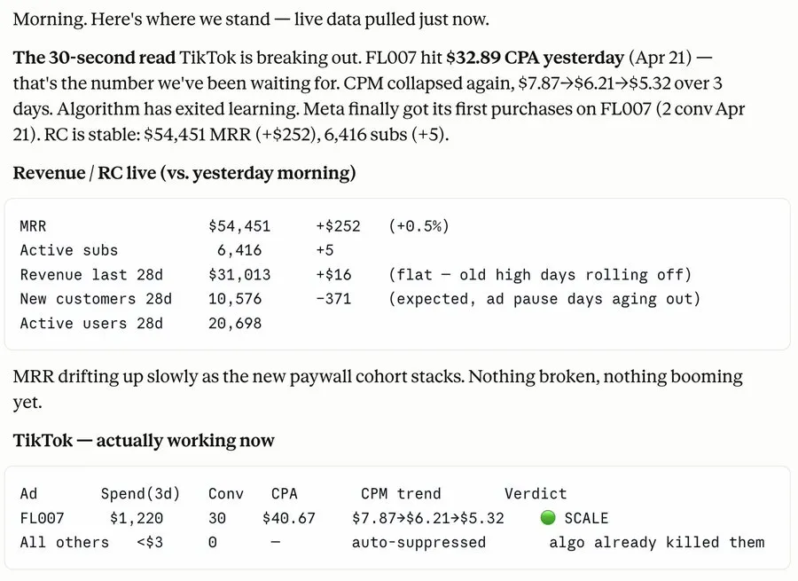 14 天 CPA 轨迹图 :系统自带三条参考线——盈亏平衡线、扩量线、止损线 。CPA 只要触碰这些线,系统就会立即发出预警。Campaign 级判决 :报表中的每一行广告活动都带有 Scale/Keep/Cut/Kill 的标签,并附带具体的判决理由。广告漏斗全拆解 :从展示(Impressions)到点击(Clicks)再到转化(Conversions),并精确计算每一步的流失率。素材排行榜 :按支出排序的素材排行榜,每个素材都配有独立的 Kill 标记,确保低效素材不浪费一分钱预算。一旦 ROI 不达标,立刻清理。