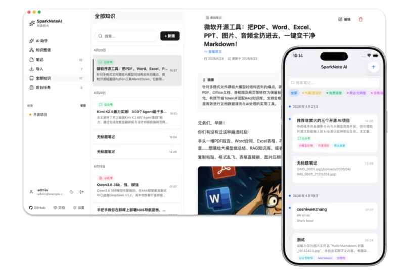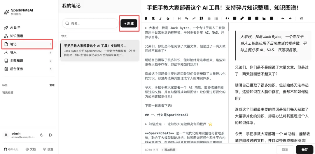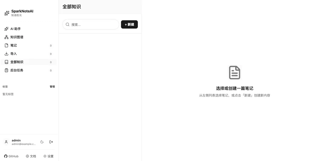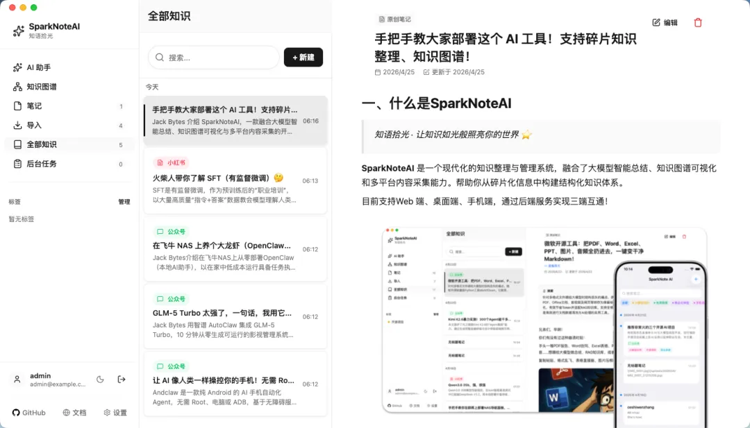 针对大众普遍存在的碎片化知识难以沉淀、信息无法串联形成结构化知识体系的痛点,本文全面介绍了开源知识管理系统SparkNoteAI,并提供了保姆级的云端部署教程与全端使用指南。