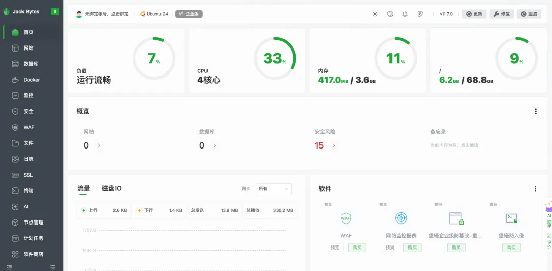 宝塔面板安装完成之后,进入到面板首页(注意需要在腾讯云对应服务器的防火墙放行宝塔面板的端口):