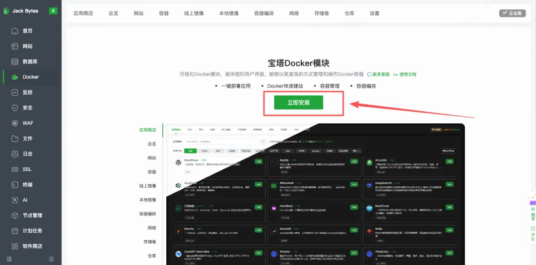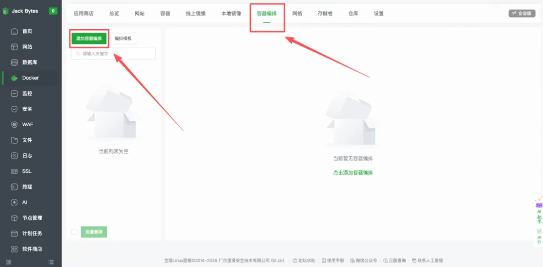 在宝塔的 Docker 页面点击「容器编排」,并点击添加容器编排: