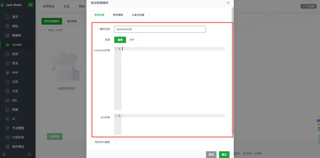 在弹出的页面中依次填写「编排名称」、「Compose 内容」、「.env内容」: